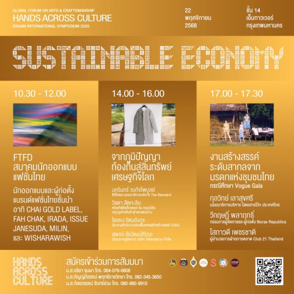 และในวันที่ 22 พฤศจิกายน 2568 จะปิดท้ายด้วยมิติของ “ความยั่งยืนและเศรษฐกิจสร้างสรรค์” (Sustainable Economy) ภายใต้องค์ความรู้การสร้างสินทรัพย์จากภูมิปัญญาท้องถิ่น และการต่อยอดมรดกครามไปสู่โมเดลเศรษฐกิจที่ยั่งยืนในระดับชุมชน จังหวัด และระดับประเทศ กับเวทีเสวนาในหัวข้อ “จากภูมิปัญญาท้องถิ่นสู่สินทรัพย์เศรษฐกิจโลก” โดย คุณนครินทร์ วนกิจไพบูลย์ บรรณาธิการบริหาร The Standard คุณวิชดา สีตกะลิน ครีเอทีฟไดเร็กเตอร์ กลุ่มธุรกิจสินค้าผ้าตกแต่งบ้านของ จิม ทอมป์สัน (Jim Thompson) คุณไชยยง รัตนอังกูร ประธานสำนักงานส่งเสริมเศรษฐกิจสร้างสรรค์ (CEA) และ คุณสุพจน์ ชัยวัฒน์ศิริกุล กรรมการผู้จัดการ บริษัท ไอคอนสยาม จำกัด เวทีนี้ยังเปิดพื้นที่ให้กับพลังของนักออกแบบไทยผ่าน FTFD สมาคมนักออกแบบแฟชั่นไทย ซึ่งจะเป็นการรวมตัวของแบรนด์ไทยชั้นนำ อาทิ CHAI GOLD LABEL, FAH CHAK, IRADA, ISSUE, JANESUDA, MILIN และ WISHARAWISH ที่จะมาร่วมแบ่งปันประสบการณ์และวิสัยทัศน์ และพลาดไม่ได้กับ เวทีเสวนา “งานสร้างสรรค์ระดับสากลจากมรดกแห่งชุมชนไทย” ซึ่งเป็นกรณีศึกษาจาก Vogue Gala โดยมีวิทยากร ได้แก่ คุณกุลวิทย์ เลาสุขศรี บรรณาธิการบริหาร นิตยสารโว้ก ประเทศไทย คุณวีกฤษฏ์ พลาฤทธิ์ กรรมการผู้จัดการและผู้ก่อตั้ง Norse Republics และ คุณโสภาวดี เพชรชาติ ผู้อำนวยการฝ่ายการตลาด Club 21 Thailand ลงทะเบียนเข้าร่วมงานฟรี ได้ที่นี่ คลิก Sustainable Economy
