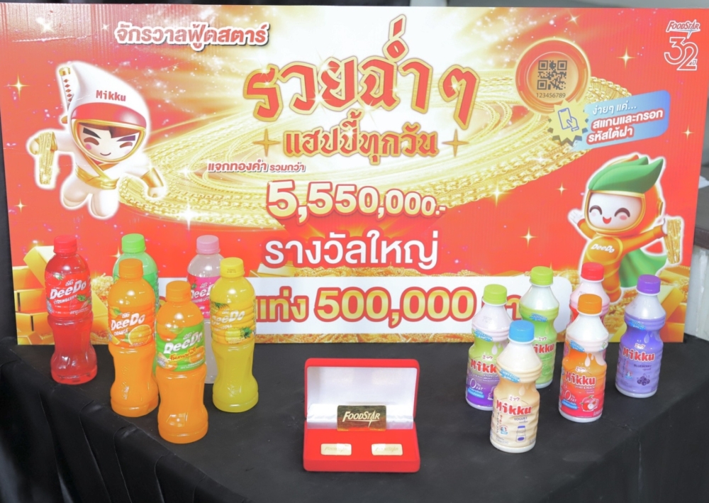 บริษัท ฟู้ดสตาร์ จำกัด ผู้ผลิตและจำหน่ายผลิตภัณฑ์เครื่องดื่มน้ำผลไม้ ประกาศความสำเร็จครั้งยิ่งใหญ่ในโอกาสครบรอบ 32 ปี กับการมอบโชคให้แก่ผู้บริโภคทั่วประเทศในแคมเปญ “จักรวาลฟู้ดสตาร์ รวยฉ่ำๆ แฮปปี้ทุกวัน 555” ล่าสุดเผยโฉมหน้า 7 ผู้โชคดีที่ได้รับรางวัลใหญ่ทองคำแท่ง ปิดท้ายแคมเปญอย่างสง่างาม รวมมูลค่าของรางวัลตลอดรายการกว่า 5,555,000 บาท