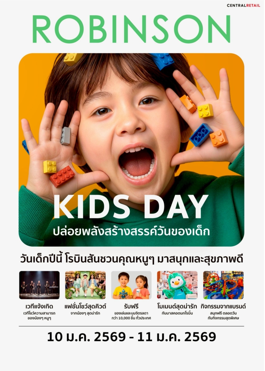 มาเติมเต็มความสุขให้ทุกครอบครัวในวันเด็กแห่งชาติ กับแคมเปญ “ROBINSON KIDS DAY” ที่อัดแน่นกิจกรรมสร้างสรรค์และความสนุกสำหรับน้อง ๆ หนู ๆ ในวันที่ 10 ม.ค. 69 – 11 ม.ค. 69 ที่ห้างโรบินสันสาขาที่ร่วมกิจกรรมทั่วประเทศ