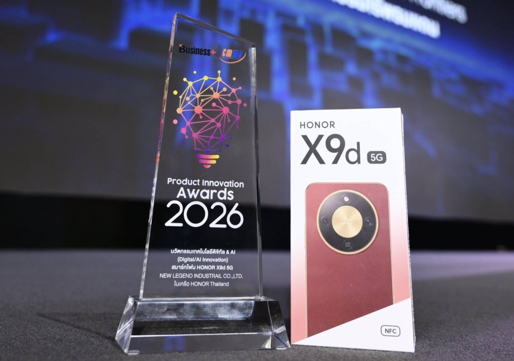23 มีนาคม 2569, กรุงเทพฯ – ออเนอร์ (HONOR) ผู้ให้บริการอุปกรณ์อัจฉริยะชั้นนำระดับโลก ตอกย้ำความเป็นผู้นำด้านนวัตกรรมอย่างต่อเนื่อง ล่าสุดสมาร์ตโฟน HONOR X9d 5G คว้ารางวัลชนะเลิศสินค้านวัตกรรมยอดเยี่ยมแห่งปี ในงาน BUSINESS+ PRODUCT INNOVATION AWARDS 2026 ซึ่งนับเป็นอีกหนึ่งบทพิสูจน์ความสำเร็จในการพัฒนาเทคโนโลยีที่ตอบโจทย์การใช้งานของผู้บริโภคยุคใหม่ได้อย่างครอบคลุมและเหนือระดับ ภายในงานได้รับเกียรติจาก ฯพณฯ นุรักษ์ มาประณีต เป็นประธานมอบรางวัล