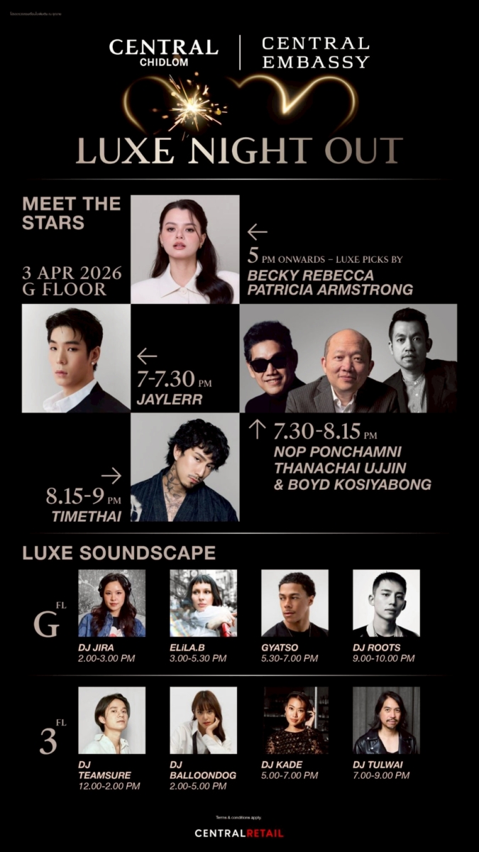 ร่วมเป็นส่วนหนึ่งของค่ำคืนแห่งแรงบันดาลใจ และสัมผัสนิยามของการช้อปปิ้ง ณ จุดหมายแฟชั่นลักชัวรีชั้นนำ ได้ในงาน “CENTRAL LUXE NIGHT OUT” ในวันที่ 3 เมษายน 2569 ตั้งแต่เวลา 17.00 น.เป็นต้นไป ณ ห้างสรรพสินค้าเซ็นทรัลชิดลม พร้อมติดตามทุกโมเมนต์ได้ทาง Facebook Page และ Instagram: Central Chidlom และ YouTube: Central Department Store และต่อเนื่องกับข้อเสนอสุดพิเศษเพื่อลูกค้าคนสำคัญจากแบรนด์ลักชัวรีชั้นนำ ที่พร้อมยกระดับประสบการณ์การช้อปปิ้งของคุณให้เหนือระดับ