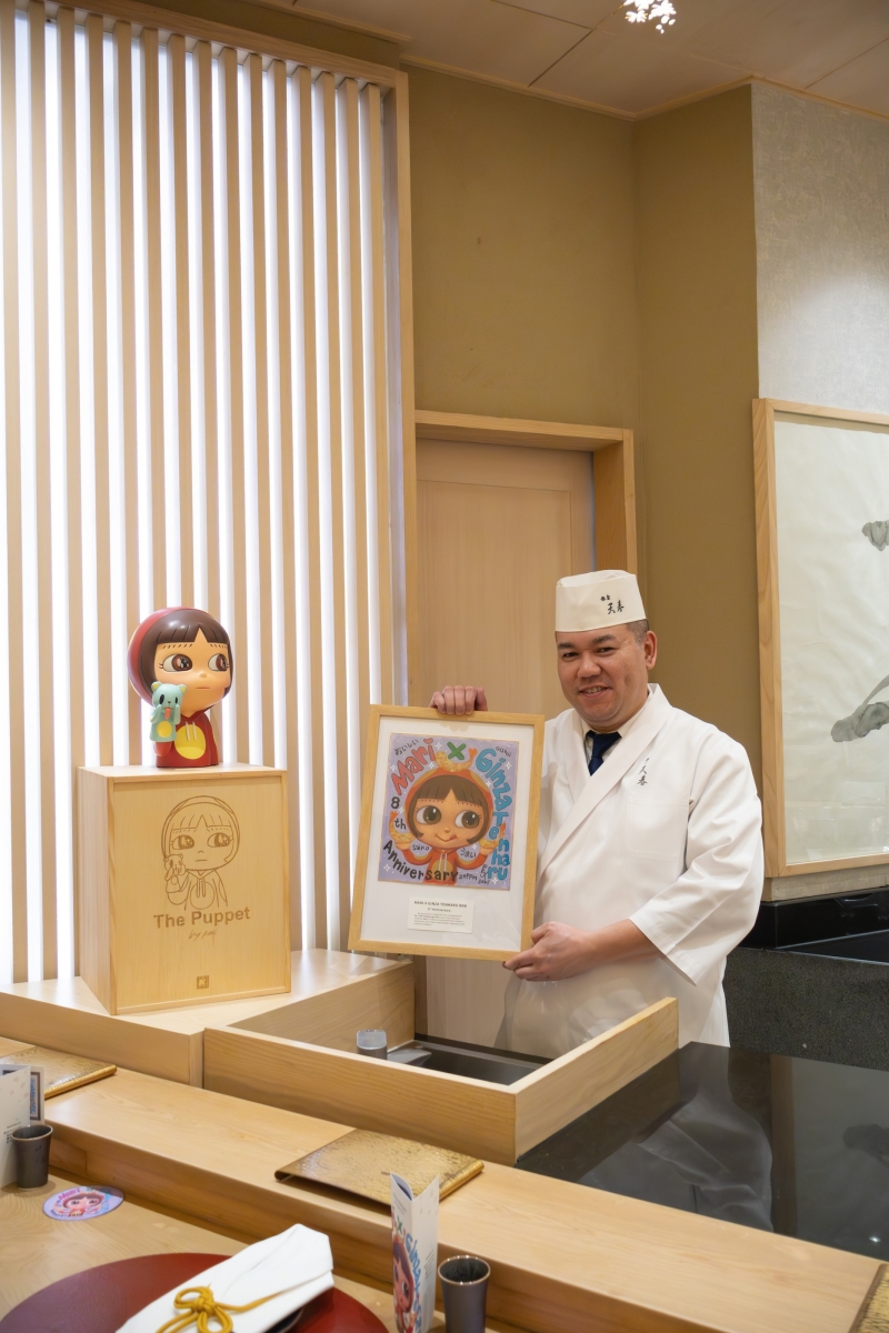 ในโอกาสฉลองครบรอบ 8 ปีนี้ ร้านได้สร้างสรรค์ความพิเศษที่เชื่อมโยงศิลปะการทำอาหารเข้ากับศิลปะร่วมสมัย ผ่านความร่วมมือกับ “พิทักษ์พงศ์ พิพิธกุล” หรือ “PEX” ศิลปินผู้เชี่ยวชาญด้าน Abstract Line Art ที่ได้ถ่ายทอดบรรยากาศแห่งความสุขจากการลิ้มรสเทมปุระลงบนผืนผ้าใบในผลงานชื่อ “Mari” ซึ่งเป็นภาพเด็กสาวที่เปล่งประกายรอยยิ้มยามได้สัมผัสรสชาติอาหาร ลายเส้นอิสระและจังหวะเฉพาะตัวของผลงานสะท้อนถึงรสชาติ กลิ่น และสัมผัส